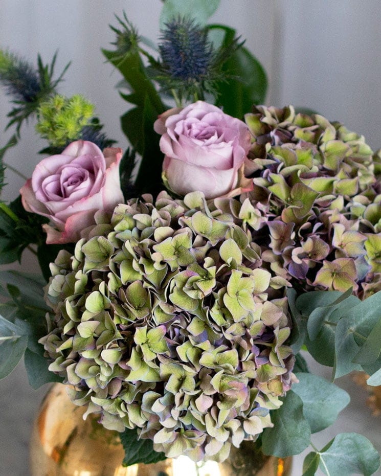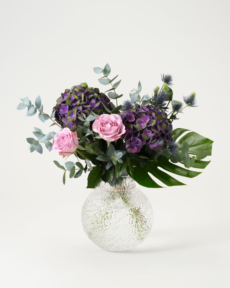 Höstens blomma är hortensian, så vad passar bättre än att skicka denna maffiga bukett för att visa din uppskattning? Höstkänsla tar plats i rummet och innehåller ljuvlig hortensia tillsammans med rosor, tistel, monstera och eukalyptusblad.