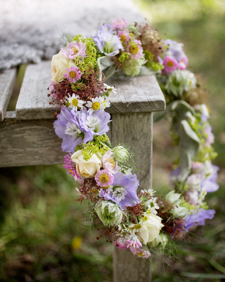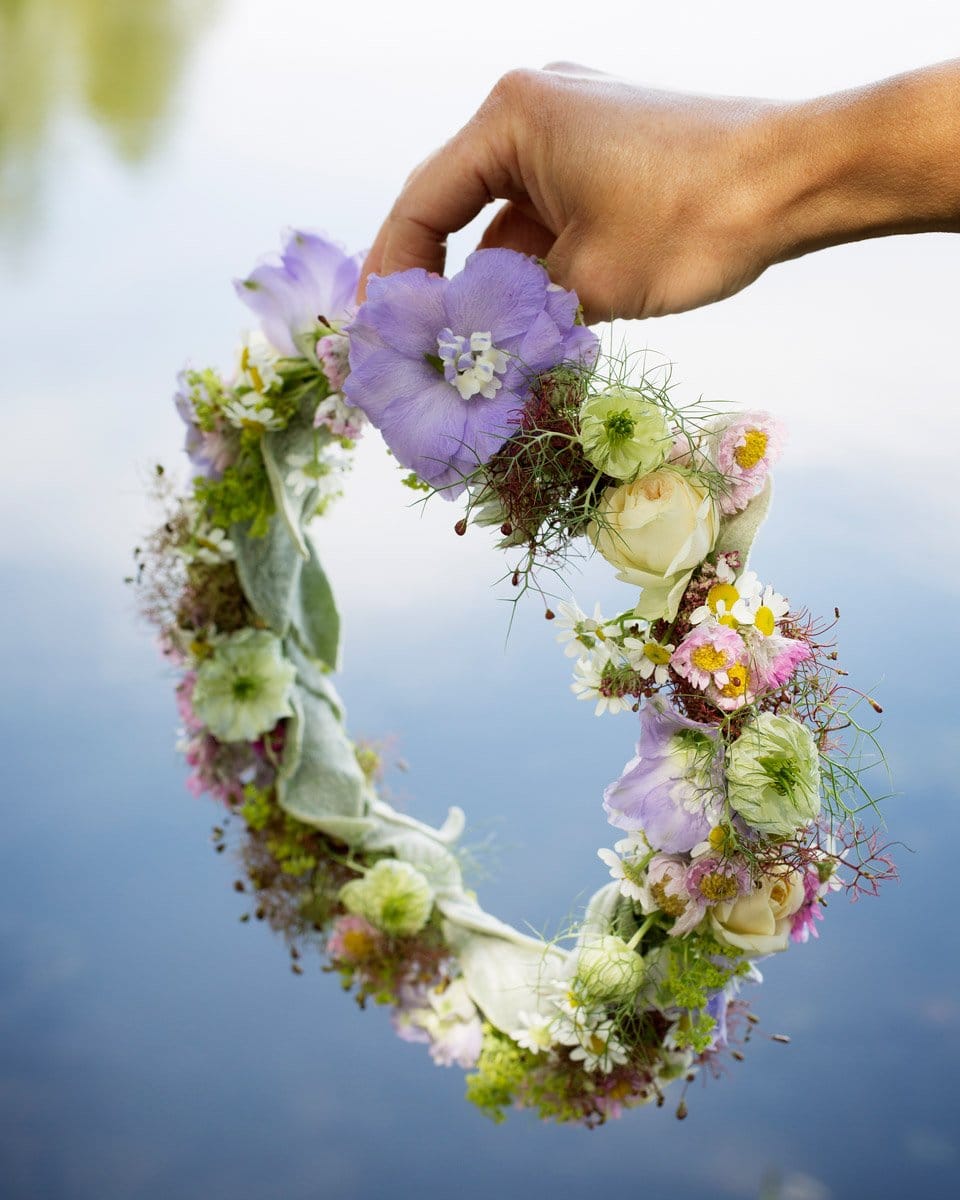 Bind huvudkransen i lugn och ro dagen före sommarfesten. Spreja med vatten, lägg i plastpåse, förslut och förvara i kylen tills det är dags.