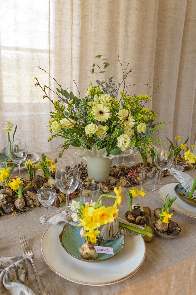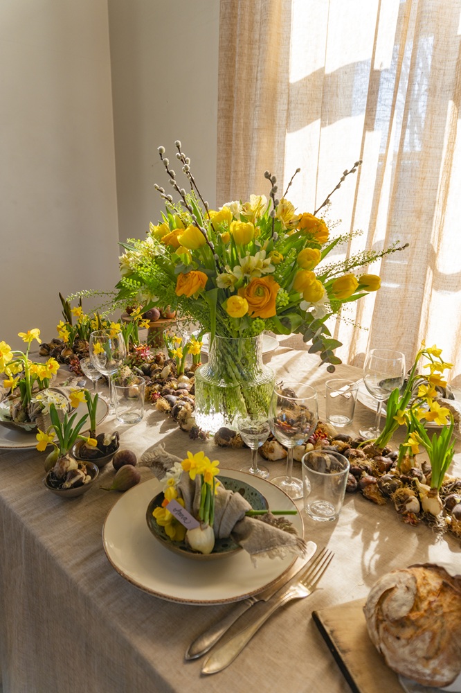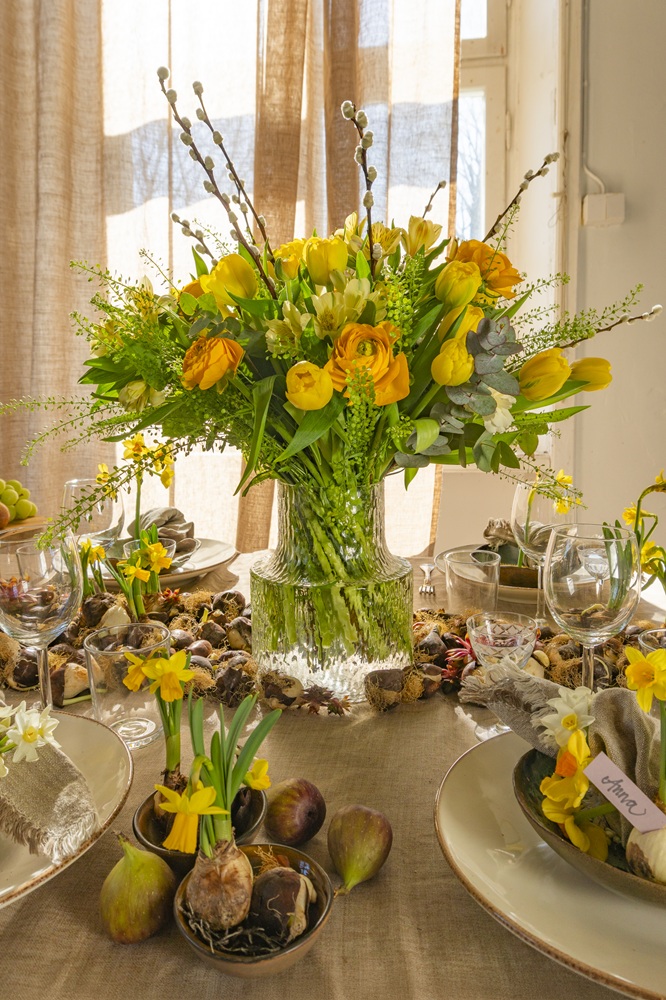 Buketten Vild påskbukett går i gyllengula toner och lyser upp som en sol. Med denna bukett skapar du en riktig påskkänsla var den än placeras.