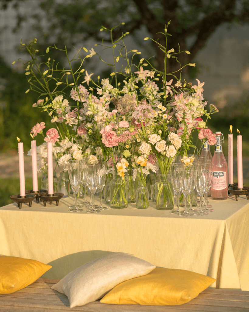 – Låna eller köp secondhandvaser i olika storlekar eller hyr av din lokala florist. För att få volym och frodig känsla kan man be vänner och släktingar plocka vackra kvistar, grönt eller trädgårdsblommor så att det blir en fin bas i vaserna. Sedan köper man godbitarna av floristen som kan hjälpa till att välja ut sorter efter färgtema.