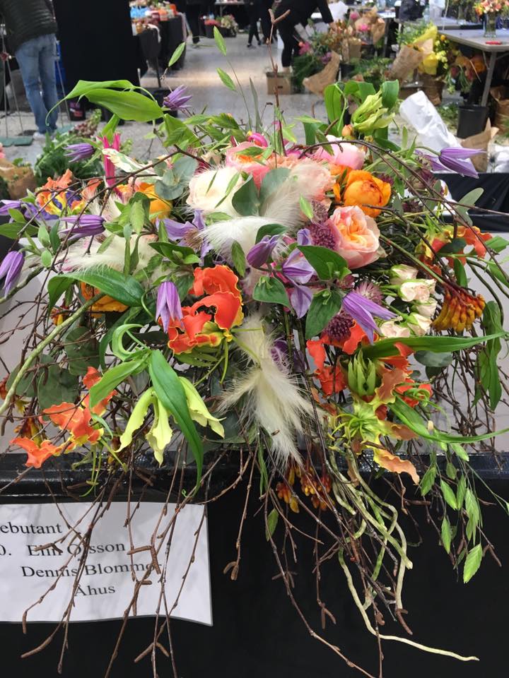 De blommorna jag hade i mitt arrangemang var bland annat nerine, ranunklar, glariosa, pion, rosor, clematis, stjärnflocka m.m. Färgerna blev väldigt färgstarka, nästan som en härlig solnedgång. Jag ville få fram den mer vilda känslan med volym så att det inte blev så platt.
