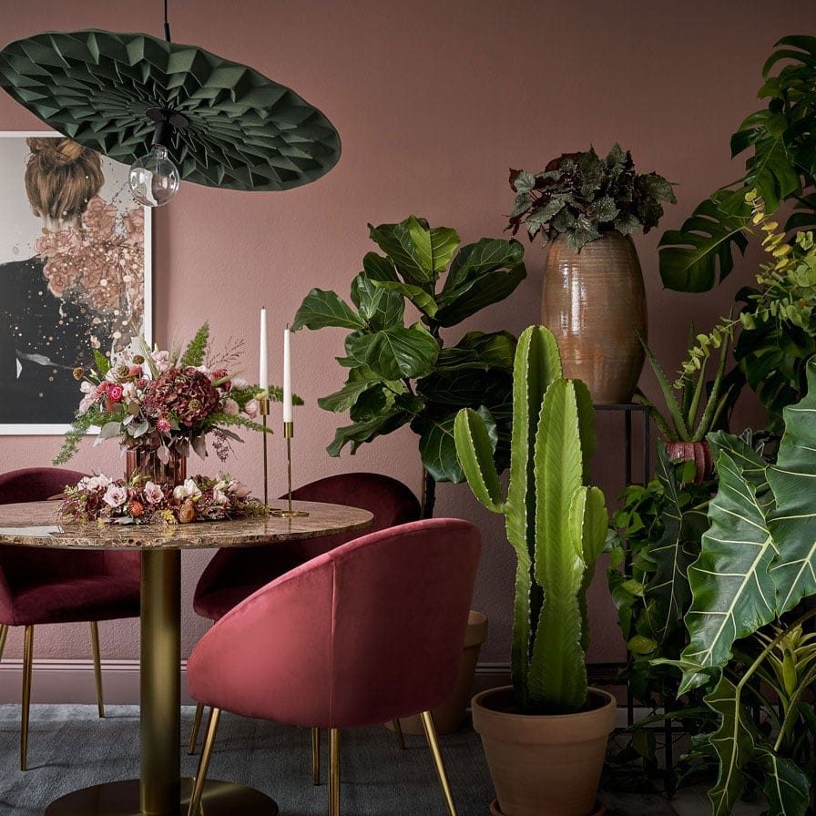 Stora träd och gröna växter fortsätter att vara populärt och ger en härligt ombonad djungelkänsla. Monsteran har varit populär under många säsonger och i höst får den sällskap av Fikusar och Ormbunke.