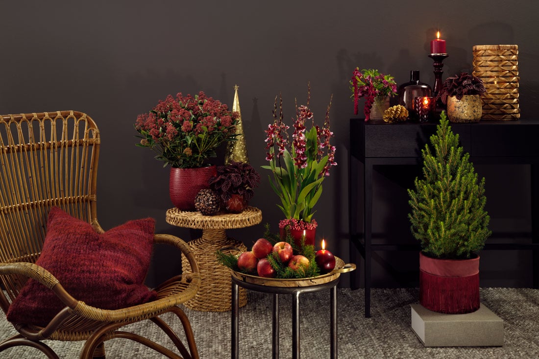 I årets julkollektion från Interflora finns det du behöver för att skapa en modern men stämningsfull jul. Färgerna går från bordeaux till guld. Krukor och vaser blandas med inredningsdetaljer som förstärker stämningen.