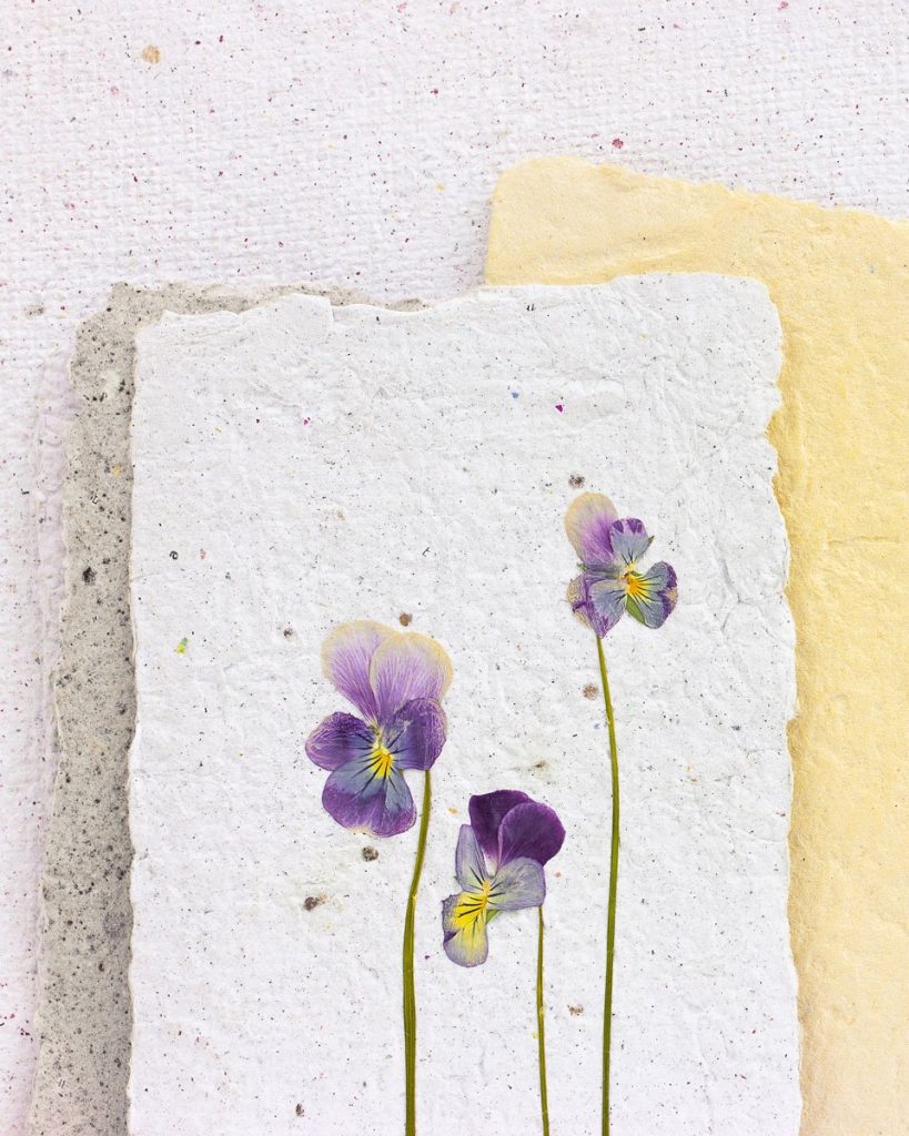 Köp enfärgade kort, gärna av handgjort papper. Limma fast dina pressade blommor försiktigt.
