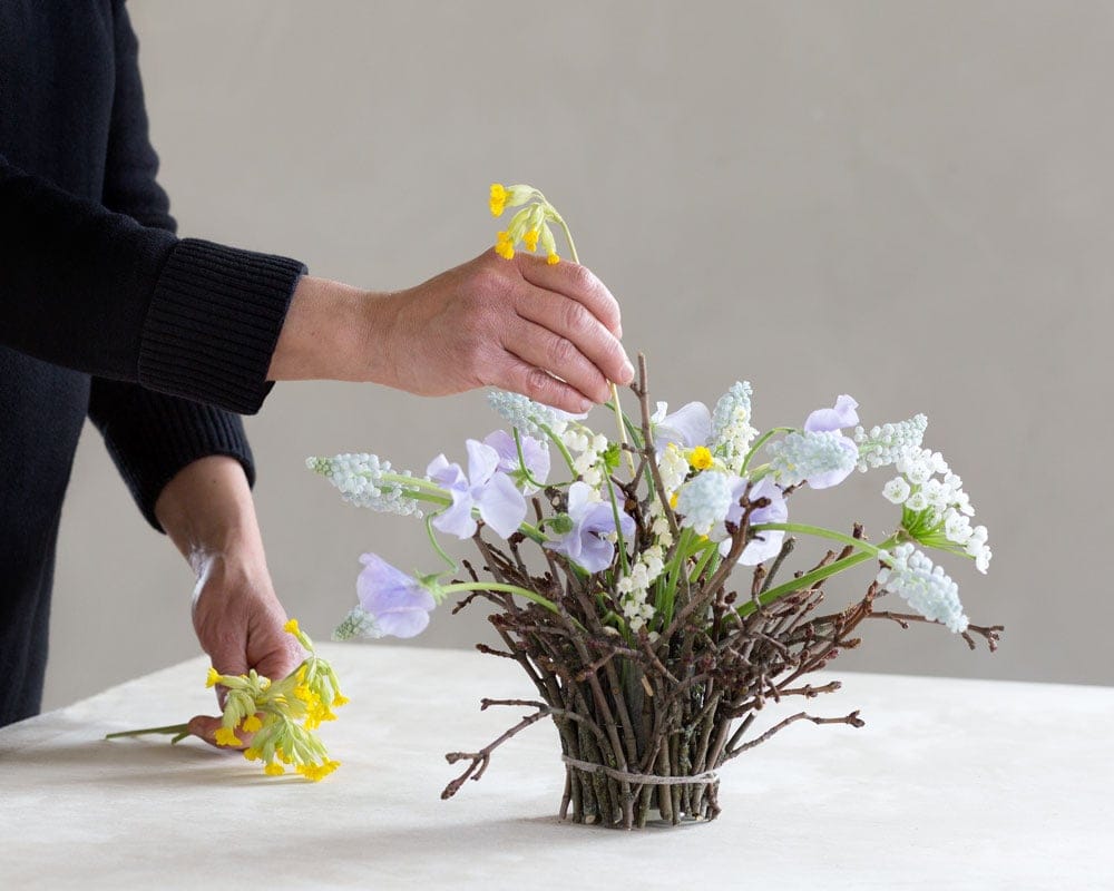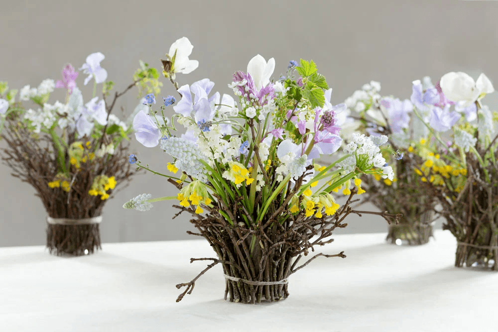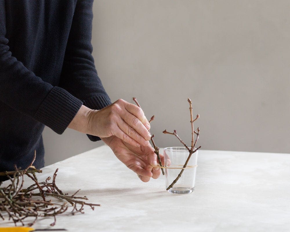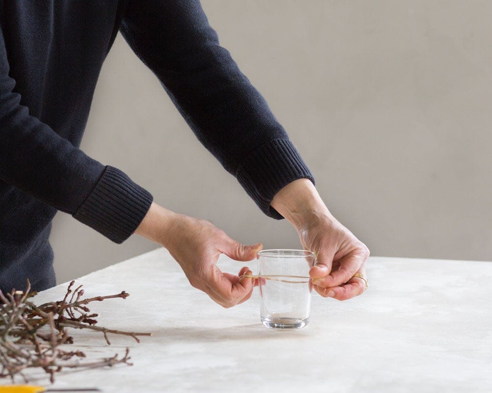 Att skapa vaser med grenar blir effektfullt då de bryter fint mot de vackra, skira blommorna du sätter i dem. Här visar vi hur du gör små grenvaser med hjälp av kvistar, ett glas, en gummisnodd och en bit snöre.