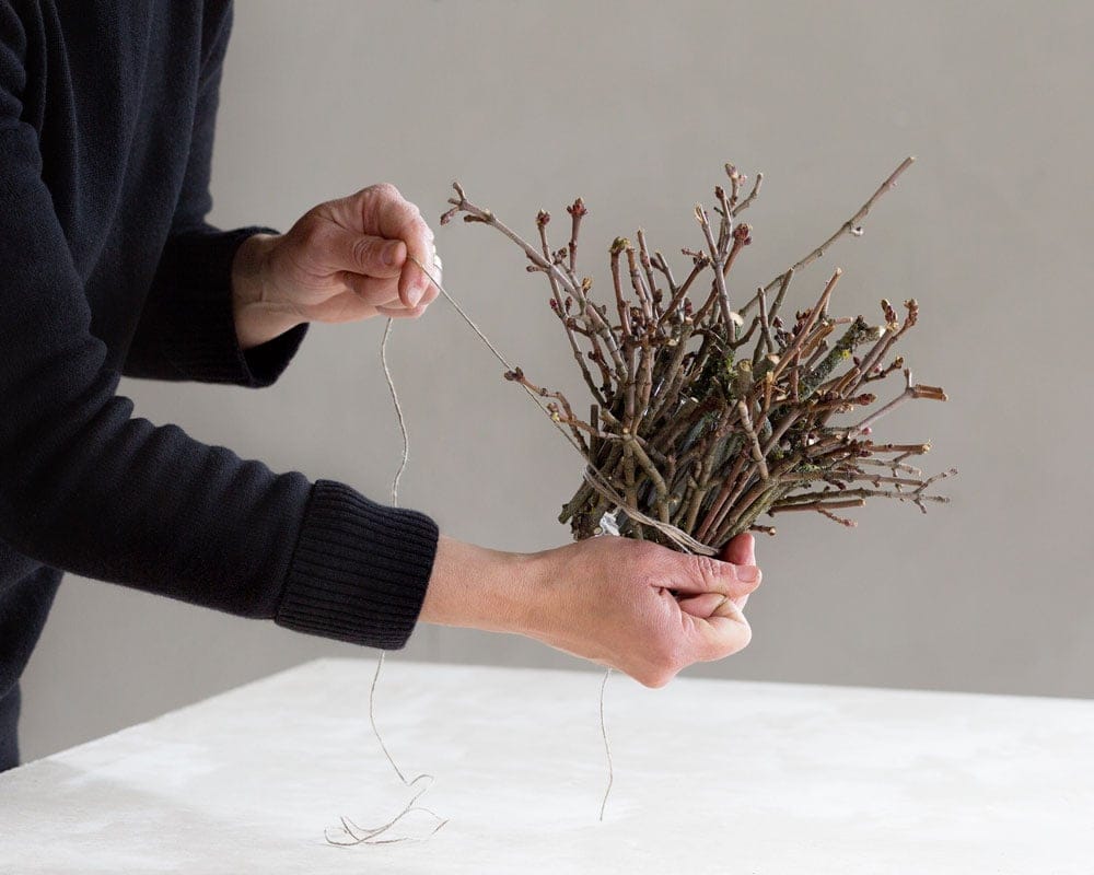 5. Vira snöret runt glas och grenar flera varv så att det sitter. Knyt hårt och klipp sedan av gummisnodden.