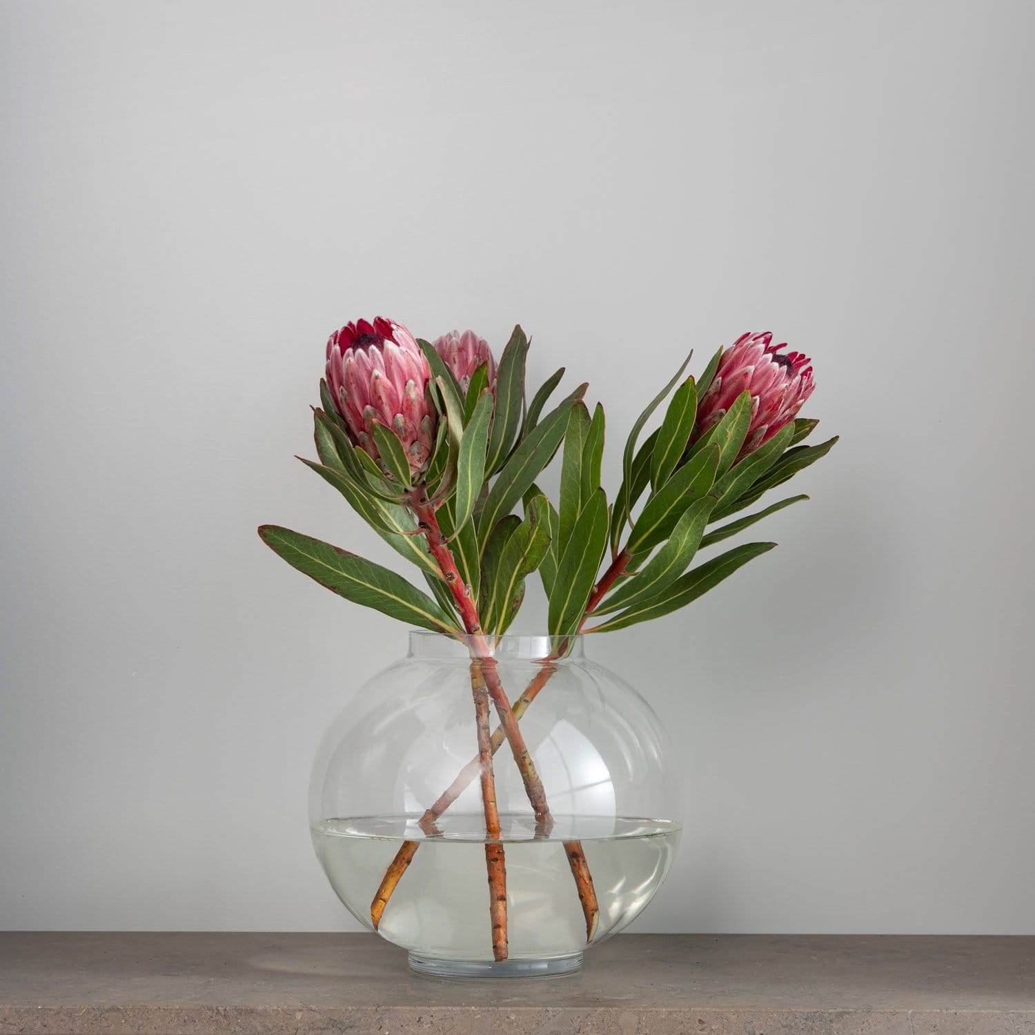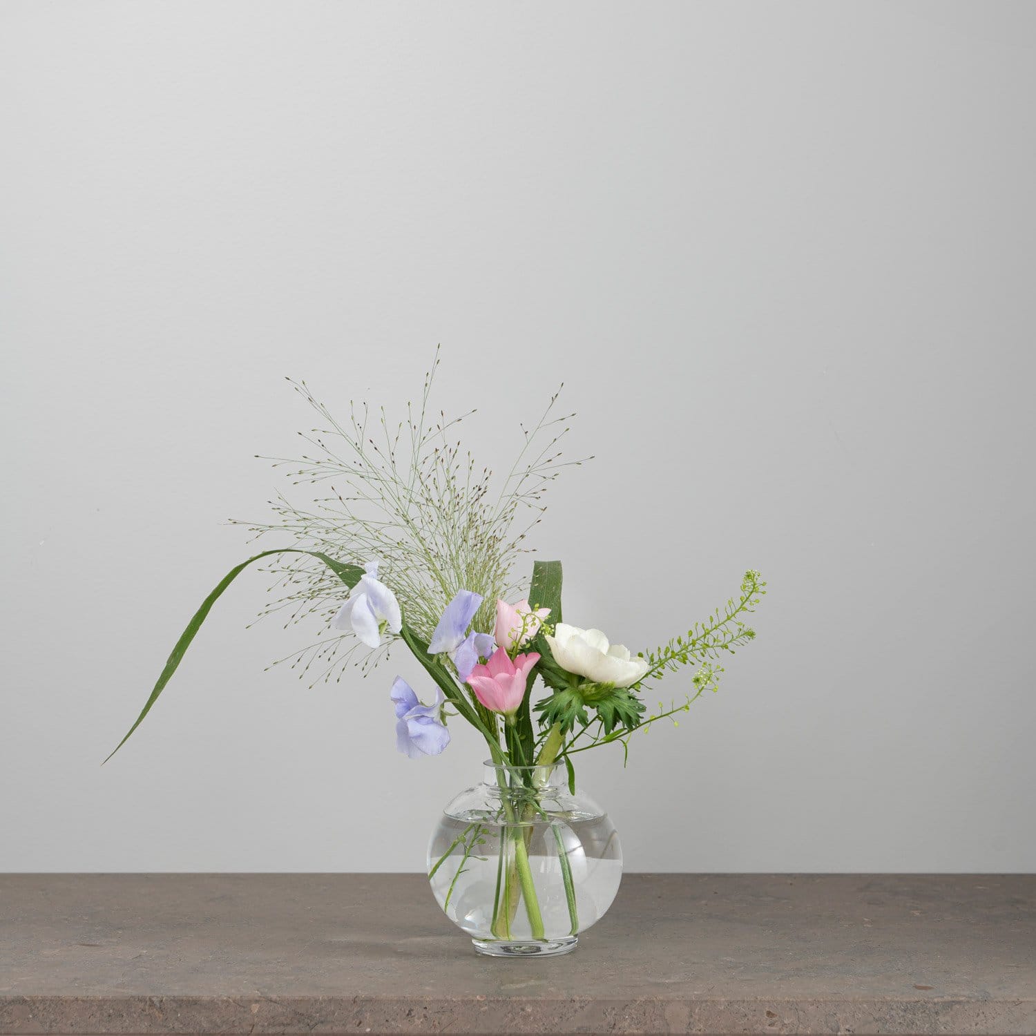 Fylliga och yviga buketter passar perfekt i en rund vas med en smalare öppning. Klotvasen ger stjälkarna plats att breda ut sig samtidigt som den mindre öppningen håller ihop blommorna och skapar en fin volym upptill i buketten.